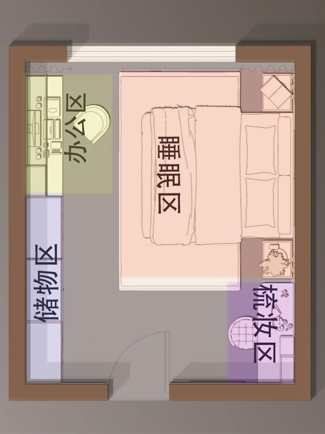 ??在布局上處于室內“黃金地段”房間的正中央,其他功能區域圍繞睡眠區展開。