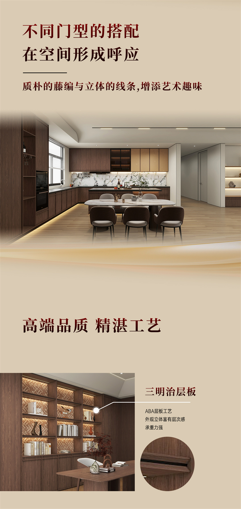 2024年新品系列,韶光 |中古風棕色胡桃木紋為主色調,搭配白色暗紋,細膩的藤編門與硬朗的骨骼門讓人聯想到古老的家具,充滿了歲月的痕跡。木紋的邊框+細密的藤編,自帶復古朦朧美感;拼樞門和藤門結合運用,使整個空間透氣感強,并擁有獨特舒適的慵懶氛圍。