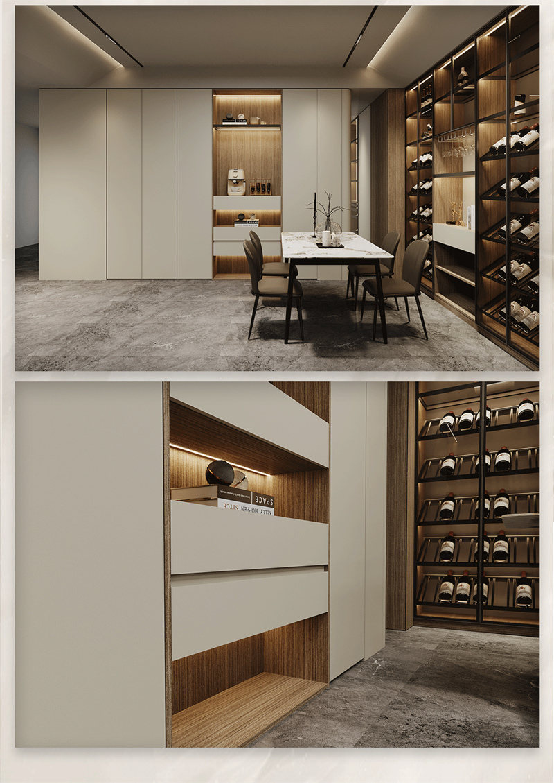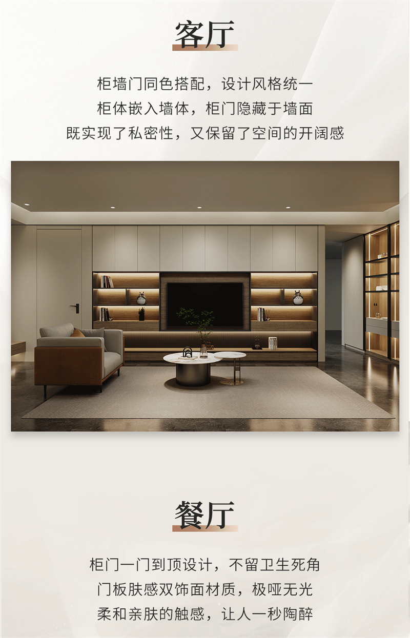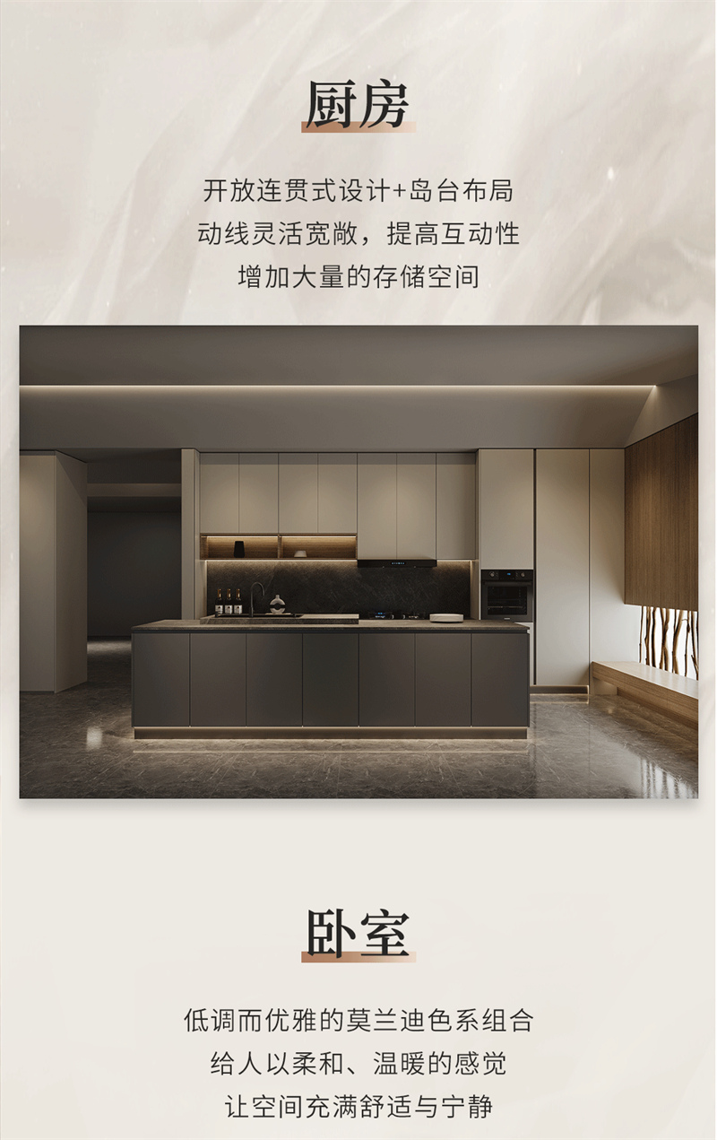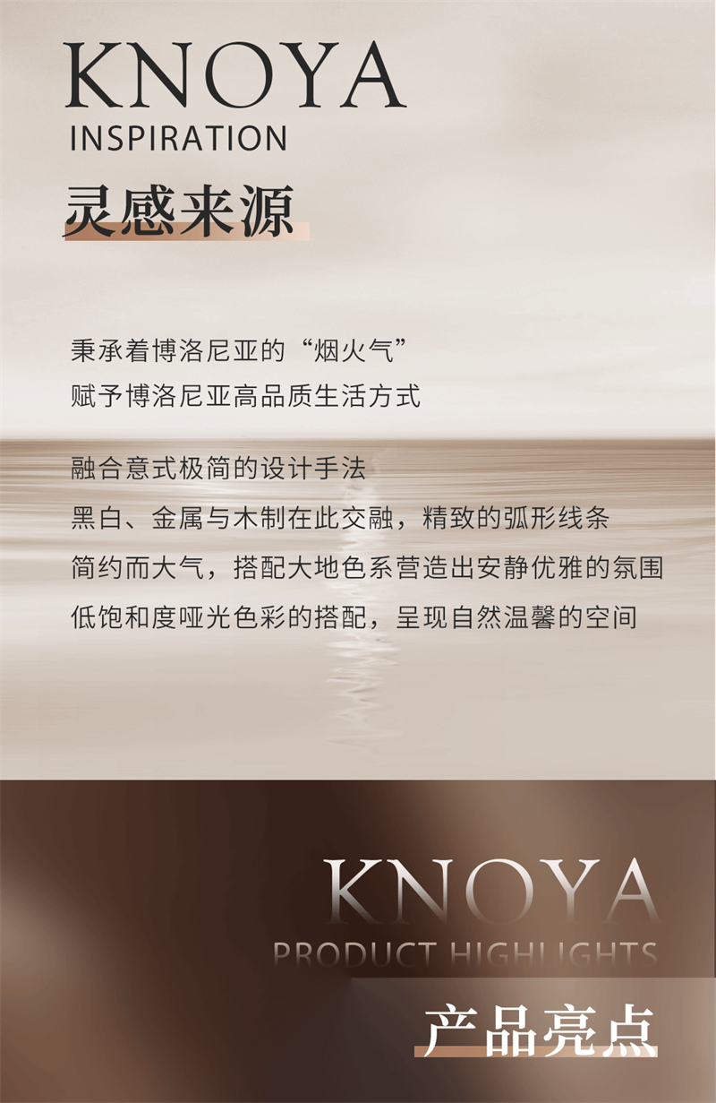 融合意式極簡的設計手法,黑白、金屬與木制在此交融,精致的弧形線條簡約而大氣,搭配大地色系營造出安靜優雅的氛圍,低飽和度啞光色彩的搭配,呈現自然溫馨的空間。