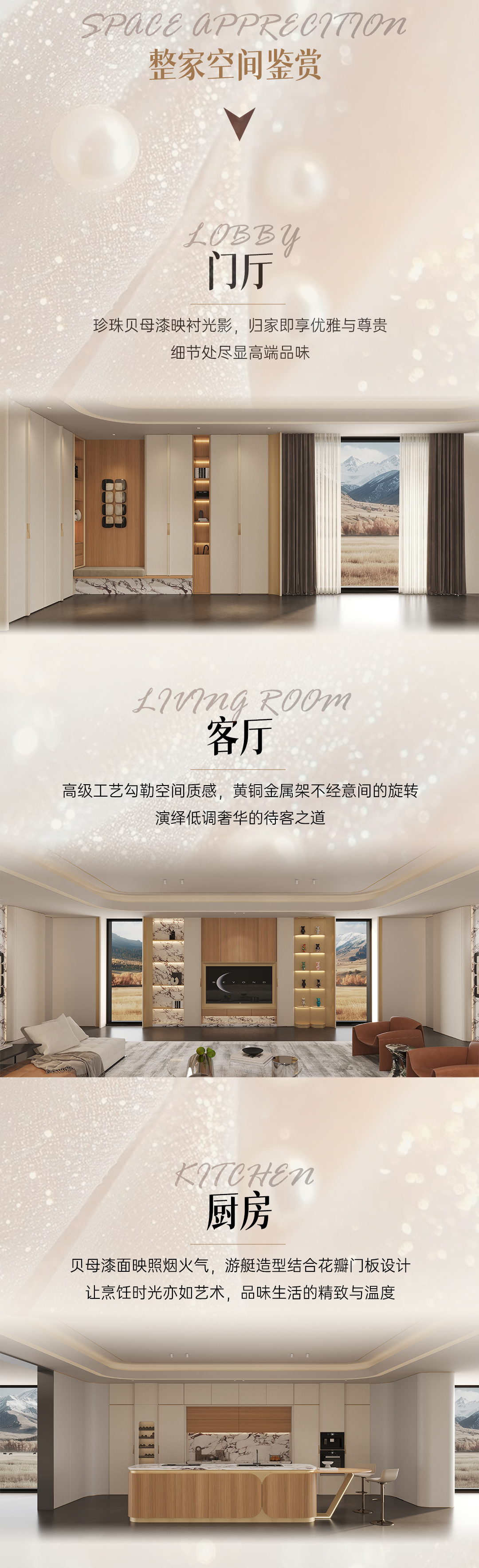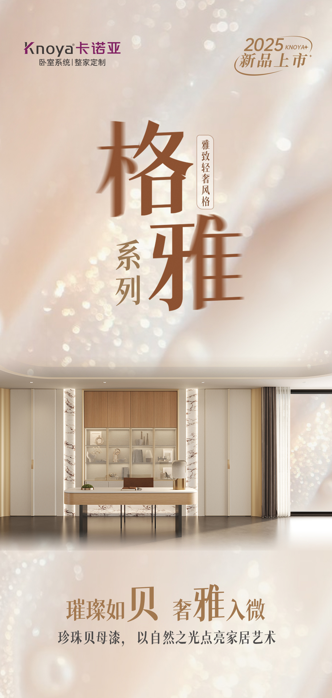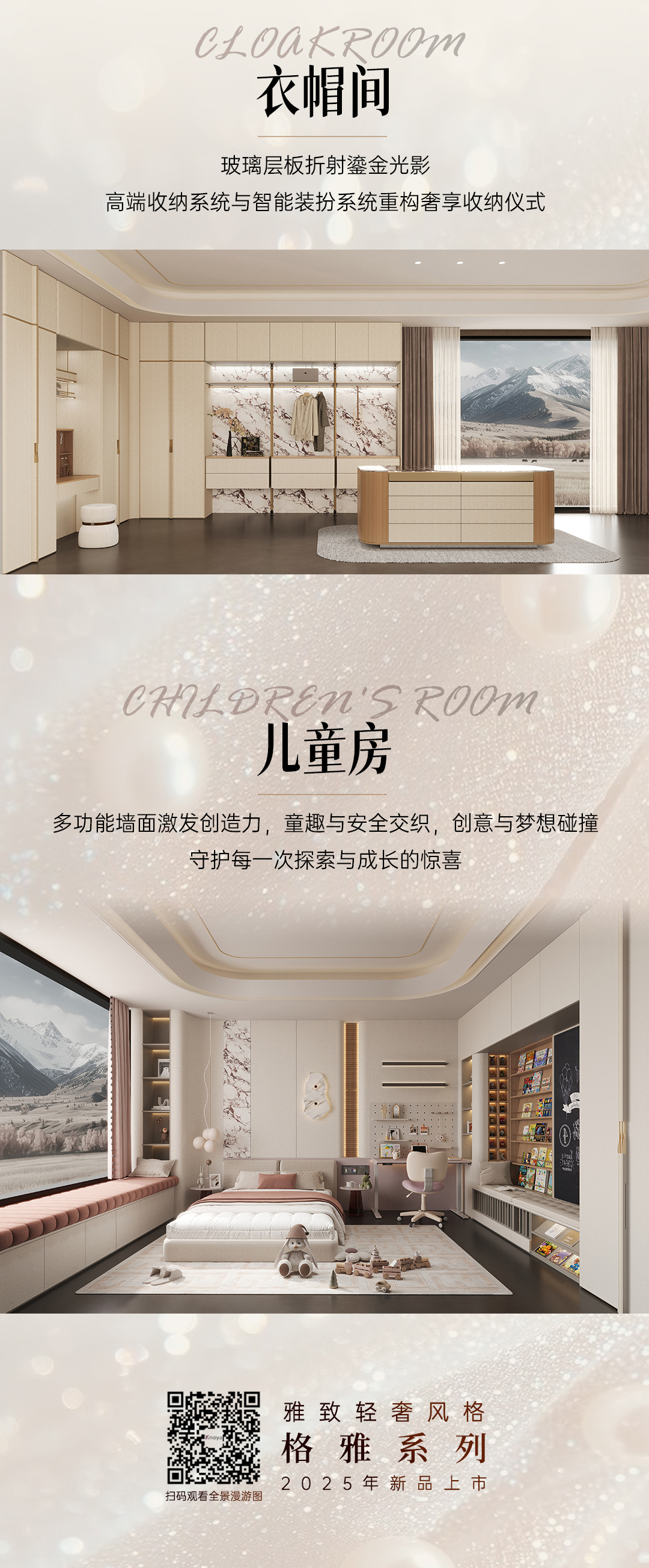 2025年新品系列,格雅系列 |雅致輕奢風格從珠寶中獲得靈感,專注于體積、線性與移性的精妙把握,巧妙展現藝術與建構間的微妙關聯(lián),以居者需求為基礎,依據整體空間開放度的細膩層次,打破傳統(tǒng)界限,賦予空間前所未有的靈動與多元。人群定位:30至45歲藝術家家庭,對生活品質持有極致追求