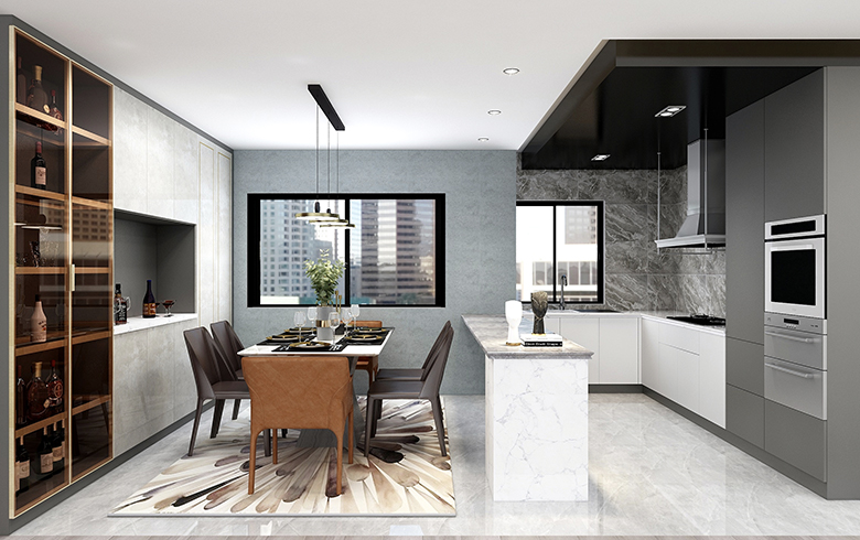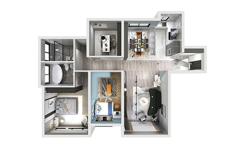這個作品將材質巧妙的運用,客餐廳采用地磚與地板的材質區別,以及餐廳的地磚上墻等。電視墻大面積的顆粒板護墻和電視處的大理石形成材質對比等,都是在運用材質進行空間劃分和區別。材質對于設計來說就相當于一個人的外形著裝打扮給人的第一印象一樣的重要,試想一下,一個連自己的著裝外貌都不精于打理的,全身邋遢臟亂的人,又怎么會給人好感呢?
