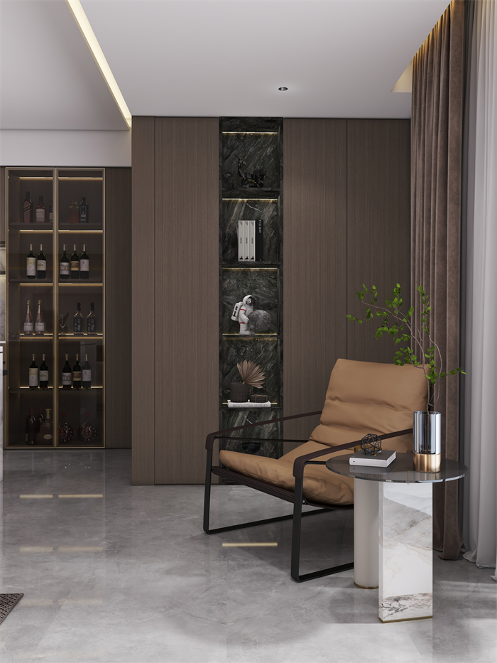 設計簡介:起居室采用大面積的落地窗,充分利用自然光線,營造明亮通風的感覺。整體色調以中性色為主,與白色大理石結合,給人一種清爽簡潔的感覺。
