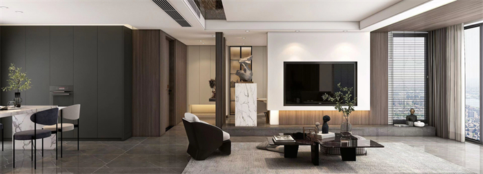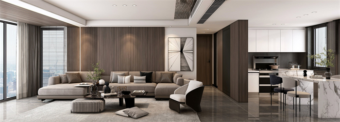 作品簡介:本作原布局是標(biāo)準(zhǔn)小四房,入戶小房間改為交互式客餐廳一體,使得整個(gè)空間更加開放通透。出發(fā)點(diǎn)為表現(xiàn)出整個(gè)空間的連貫性和交互性。全案使用了色塊面積較大的“棕絲木”。木紋細(xì)膩舒暢,結(jié)合卡諾亞專屬專利扣線,無膠安裝,海棠角完美細(xì)節(jié)呈現(xiàn)。整體深色木紋系作為主線,純色塊漆面材質(zhì)作為點(diǎn)綴,小比例藝術(shù)玻璃等;各材質(zhì)協(xié)調(diào)使用。