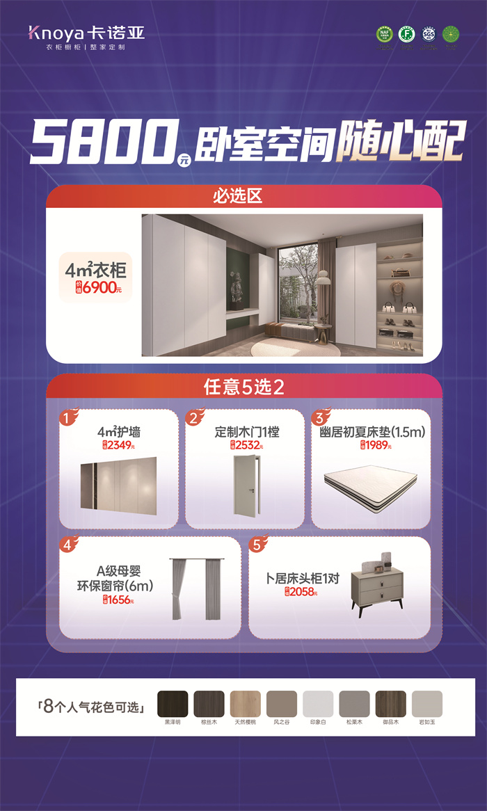 對于剛需消費者來說,臥室是全屋家裝的重中之重,如果裝修細節不如意,可能影響到每天的睡眠質量和生活狀態。有鑒于此,卡諾亞精心推出臥室空間隨心配5800元套餐,自由選購,任性搭配,以超高“顏價比”,裝出一個舒適、自在的空間。