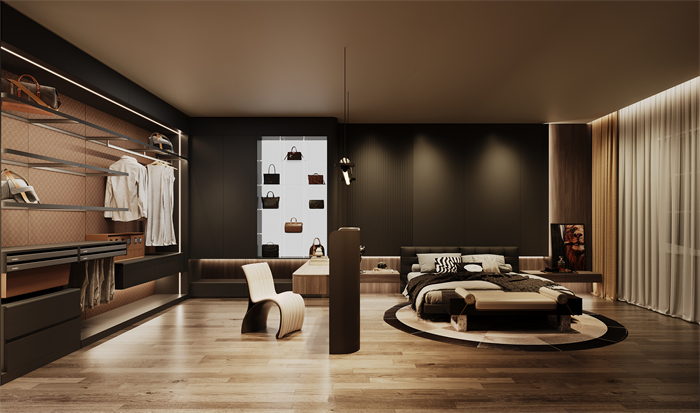 紳·逸系列設計靈感上,源于繁華都市的夜晚,低沉的色調彰顯當代企業家“閑在臥室”的生活狀態,靜謐中暗藏內斂奢華。設計手法上,整個系列展示兩個空間(客廳、臥室),以高級灰搭配深色木紋為主基調,配合流行的弧形及斜邊工藝。低調素雅的整體視覺,充分詮釋意式輕奢的美學。臥室空間結合睡眠、衣帽間及輕健身功能,符合成功人士對高品質生活和健康人生的追求。