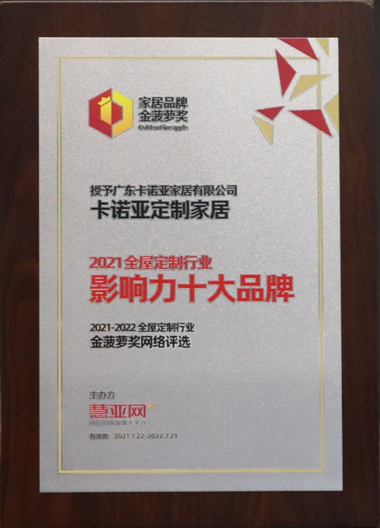 2021年7月22日,中國建博會×慧亞網聯合主辦的第六屆中國大定制家居營銷發展論壇暨中國家居品牌金菠蘿獎頒獎盛典,在廣州舉行。歷經半年來自經銷商與用戶網絡票選結果的公布,卡諾亞定制家居憑借強大的品牌影響力、優質的產品與星級的服務,最終脫穎而出,榮膺“2021全屋定制行業影響力十大品牌”美譽。
